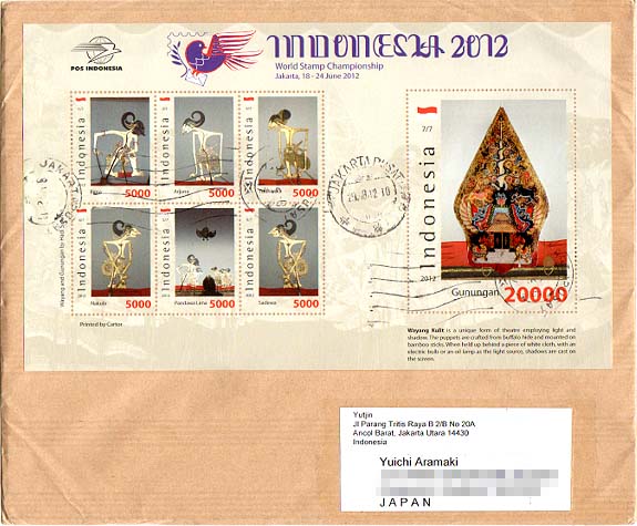 インドネシアの水牛皮付切手の実逓カバーです。 Postally used covers of "Buffalo Hide" attached stamp.