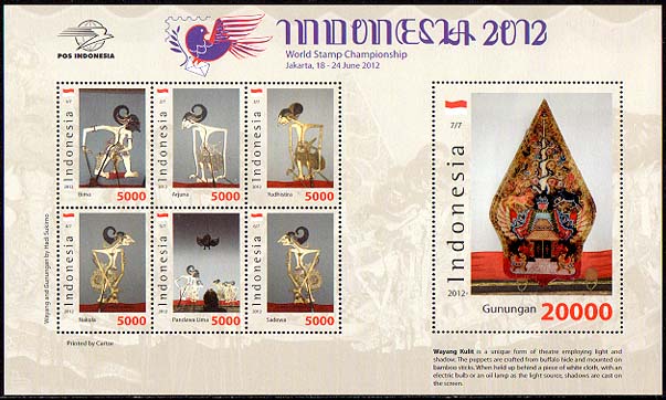 2012年、インドネシアは水牛皮で出来たグヌンガン(Gunungan)を貼付した切手(小型シート)を発行しました。グヌンガンとは、同国の伝統芸能であるワヤン・クリ(Wayang Kulit)という影絵芝居で用いられるもので、「生命の木」「自然と宇宙」といったものを象徴しているのだそうです。