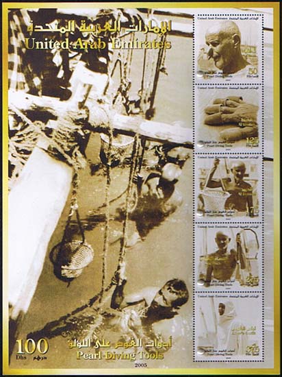 In 2005, United Arab Emirates issued a souvenir sheet of "Pearl Diving Tools". Real pearl halves affixed to each stamp in the sheet.