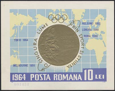1964年にルーマニアが発行した、東京オリンピックの金メダルを描いた切手は、140mm×110mmもあり、コロンビアの書留切手の記録を59年ぶりに更新しました。(小型シート全体が切手になっています。)