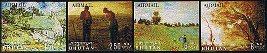 厚手の紙の表面に凸凹の加工をして、油絵の雰囲気を出した切手です。ブータンから3回発行されました。