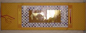 この巻物切手には、(1)絹製の巻物の上に、465mm×1,000mmの大きな紙製の切手シートを貼り付けたもの。(2)絹製の巻物全体が切手シートになっているもの(絹製切手の一種になります)。の2種類が有ります。なお、巻物全体の大きさは、600mm×1,880mmもあります。