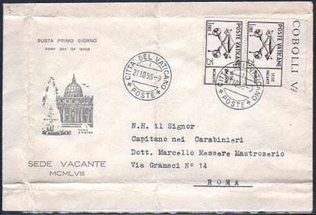 使徒座空位切手の実逓カバーです。 A Postally used cover of "Sede Vacante (Interrgnum Issues) stamps".