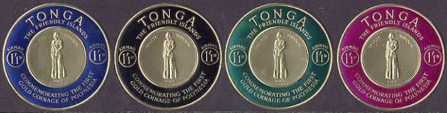 1963年にトンガから発行されたアルミ製の円形切手(コイン型変形切手)の発行前に作られた、プルーフ(試作品)の色々です。