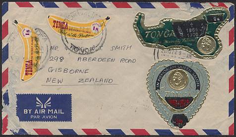 トンガが発行した変形切手を何枚か貼った実逓カバーですが、その中の「アルミ製のハート型切手」の加刷が二重になっています。たまたま発見したもので、保存状態は良くありませんが、エラー切手が実際に郵便に使われた例は非常に少なく貴重です。